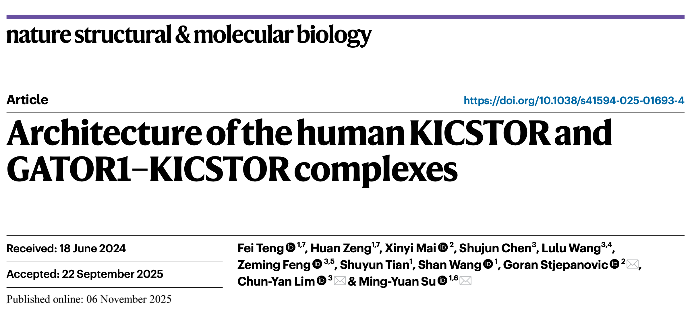 2025.11.11 Our collaboration with the laboratories of Ming-Yuan Su (SUSTech, Shenzhen) and Goran Stjepanovic (CUHK, Shenzhen) has come to fruition. Our study, using cryo-EM and cell biological approaches, revealed for the first time the inner workings of the human KICSTOR and KICSTOR-GATOR1 interface, providing insights into how GATOR1 is anchored to lysosomes to achieve nutrient-dependent mTORC1 regulation. Congratulations to all! 🥳 https://rdcu.be/eOzBk